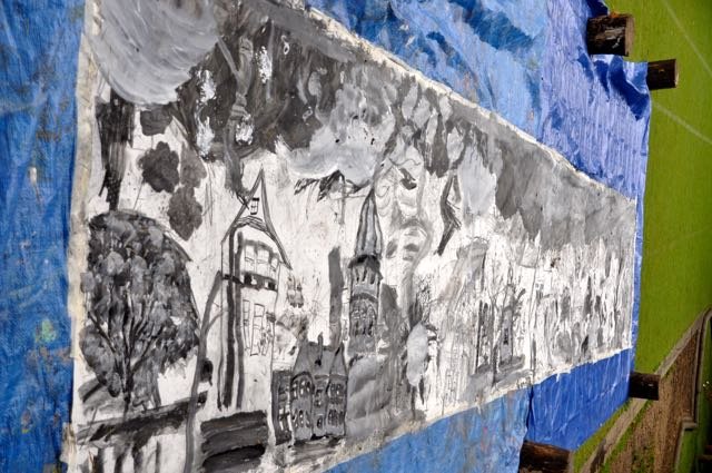 Matthew began by showing the children some of his own paintings, along with the work of John Virtue. We talked about how artists have always been inspired by the great outdoors. We then got to work and together unrolled a giant roll of beautiful heavyweight paper. We would work together, look at our surroundings and work with charcoal to sketch what we saw. We had thick and thin charcoal sticks and Matthew suggested that we tape the charcoal to sticks and make our own drawing implements. A longer tool is sometimes easier to draw with, especially on a larger scale. Some of us worked on the shrubs, bushes and buildings, while others got to grips with the dark brooding skies that were threatening our outdoor painting activity!